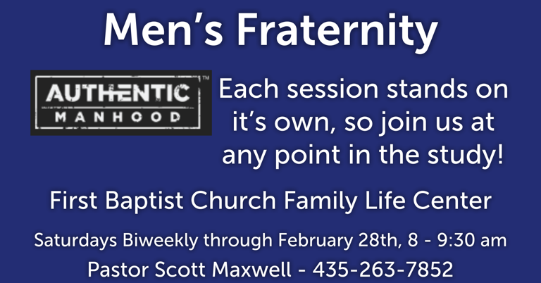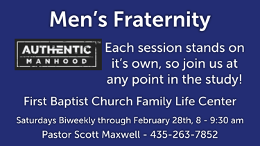 We have started a Men's Fraternity which meets every other week on Saturdays in the First Baptist Church Family Life Center at 8 am. Please see our Church Calendar to verify dates of meeting as we do at times cancel a meeting for various reasons. We currently working through the study, "Authentic Manhood," which focuses on what it means to be an authentic man. While this study is non-denominational, it does use the Bible as it's primary source for guidance along with sociological studies which Provide insight into the disintegrating societal concept of what it means to be a man in every aspect of our lives.